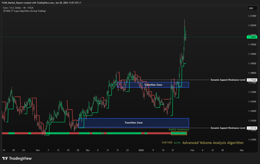 Bullish – EUR/USD has maintained a bullish sentiment for the last eleven days, supported by strong upside momentum and aggressive bullish continuation. Price has decisively broken above prior resistance areas, confirming buyer dominance in the current structure. Higher highs and strong impulsive moves suggest sustained demand. As long as price holds above key support zones, the bullish bias remains intact.