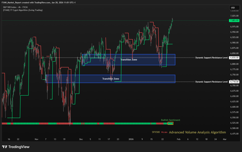 Bullish – The S and P 500 is showing a clear bullish sentiment over the last two days, supported by strong upside momentum and decisive price expansion. Price has reclaimed and held above key structural levels, signaling renewed buyer control. The recent impulsive move suggests confidence in continuation rather than exhaustion. As long as price remains above the primary support zones, the bullish bias remains intact.
