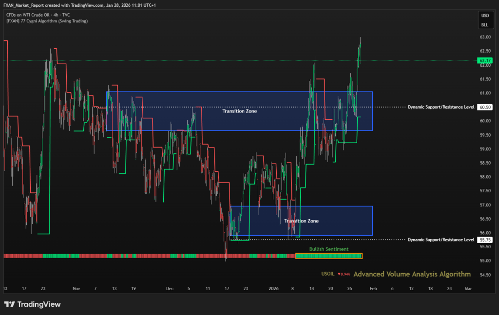 Bullish – WTI Crude Oil maintains a strong bullish sentiment that has been in place for almost three weeks, supported by consistent higher highs and higher lows. Price action continues to respect key structural levels, indicating sustained buying interest. Momentum remains constructive, suggesting the broader uptrend is still intact. As long as price holds above critical supports, bullish continuation remains favored.