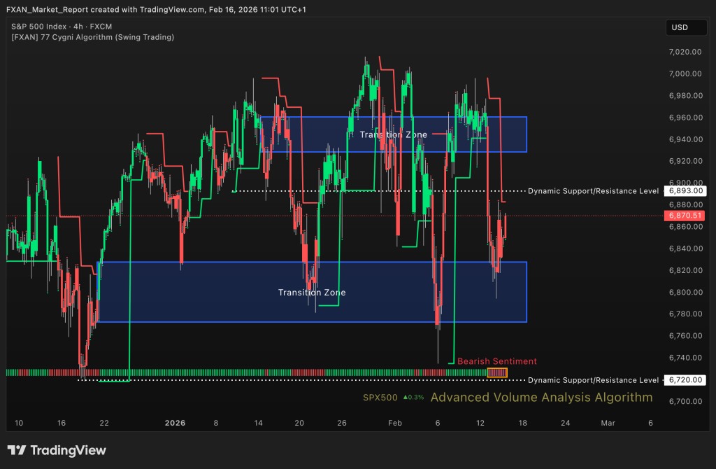 Bearish – The S&P 500 shows bearish sentiment over the last week, with increased downside volatility. Price has struggled to reclaim prior support turned resistance areas. Sellers remain active on rebounds, limiting upside continuation. The short term structure favors cautious positioning.