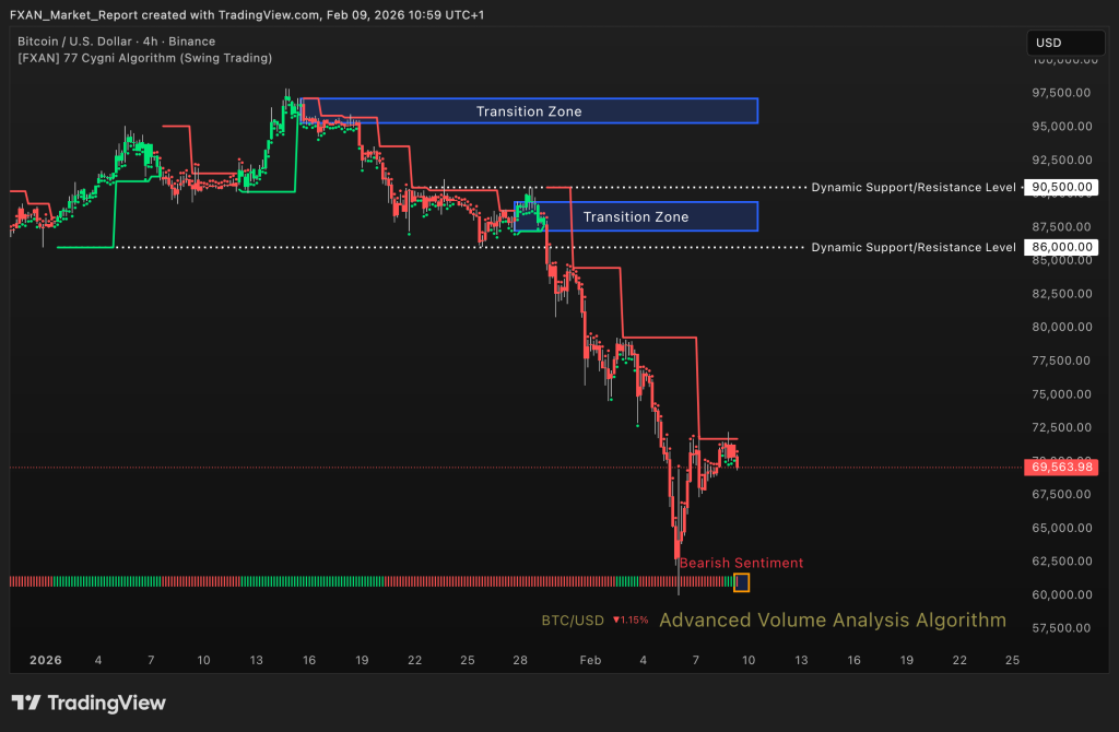 Bearish – BTC/USD shows bearish sentiment over the last two hours following renewed selling pressure. Price has failed to reclaim broken structure and remains under heavy resistance. Downside momentum is dominant in the short term. Sellers continue to control intraday price action.