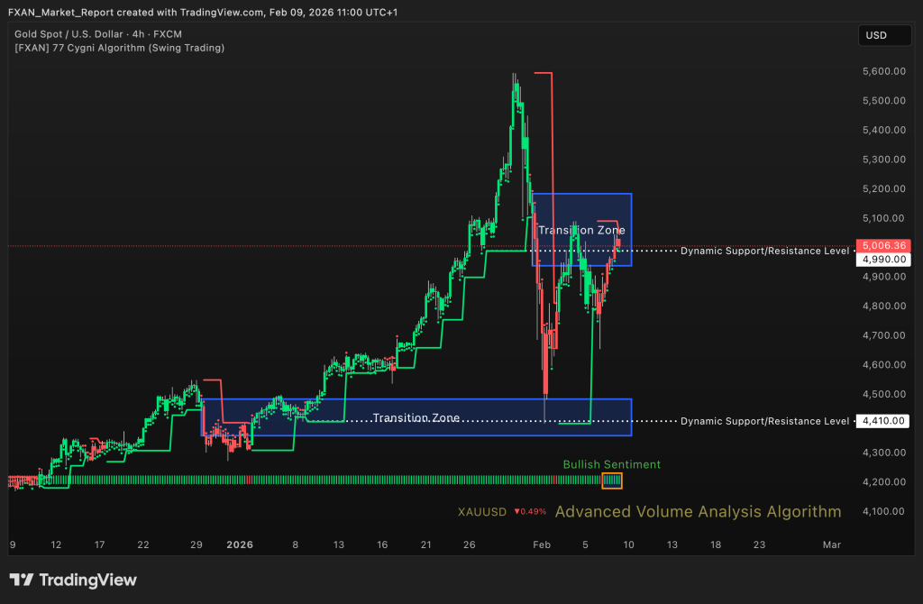 Bullish – Gold maintains a bullish sentiment over the last few days, supported by strong directional moves and elevated volatility. Price action continues to respect higher value areas despite sharp intraday swings. Buyers remain active on pullbacks, keeping bullish structure intact. Overall trend strength remains elevated.
